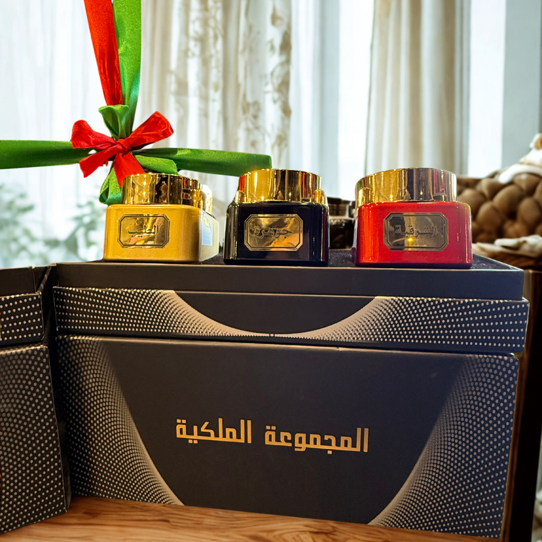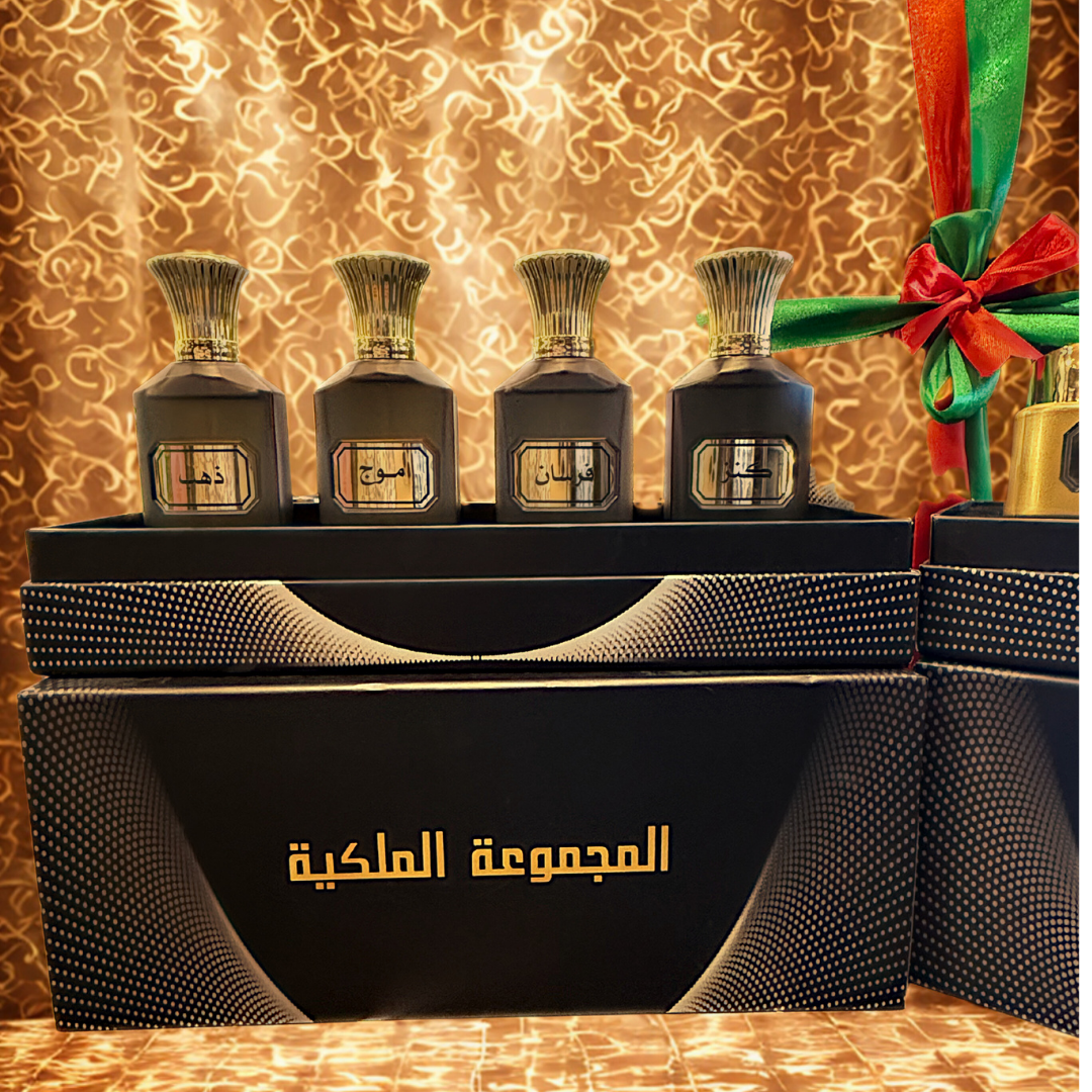 Royal Collection is a luxurious set featuring 4 Arabic and French perfumes (50 ml each), along with a box containing 2 incense sticks, 1 scented oud, and 6 musk, offering a complete fragrance experience that combines French elegance with oriental authenticity.